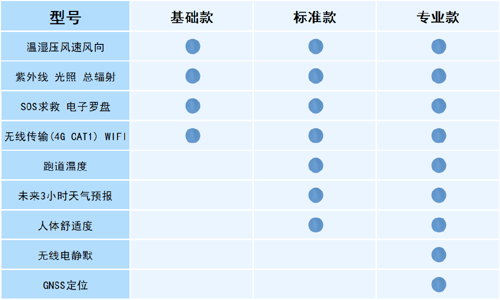 并具备户外的SOS求救、电子罗盘、跑道温度、未来3小时天气预报、人体舒适度、无线电静默、GNSS定位等功能,